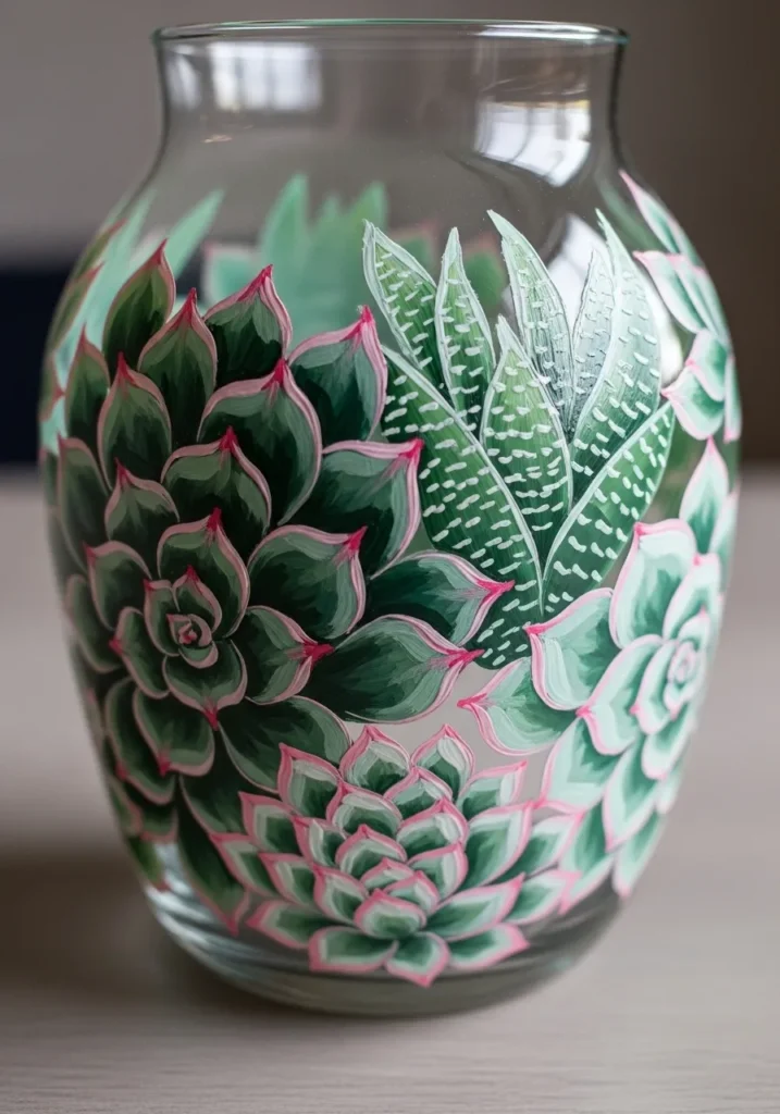 This rounded glass vase is a botanical beauty featuring lush, hand-painted succulents in a gorgeous array of greens and pinks. The design showcases several different species, including tight rosettes with deep emerald centers and delicate pink tips, alongside a striking striped aloe plant with crisp white speckles. The paint application is thick and purposeful, creating a layered, dimensional look where individual leaves seem to overlap and sprout right off the smooth glass surface. By keeping the background transparent, the focus remains entirely on the rich textures and the soft, minty color palette of these hardy little plants.