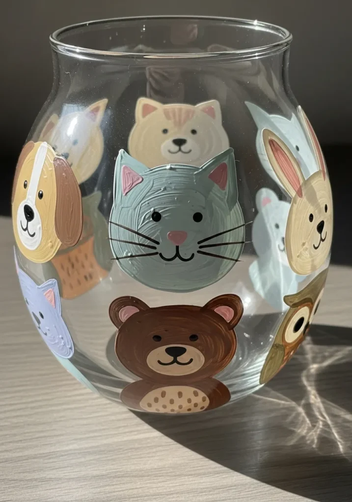 I think this is the most precious idea for a nursery or even just to brighten up a craft room. If you are a fan of that cute kawaii style, you will have so much fun deciding which animals to include in your little glass zoo. It is actually a very approachable project because the faces are made of simple circles and ovals, so you don’t need to be a professional illustrator to get a great result. I love how the visible brushstrokes give each animal its own unique personality and a cozy, handmade feel that you just can’t find in a store.