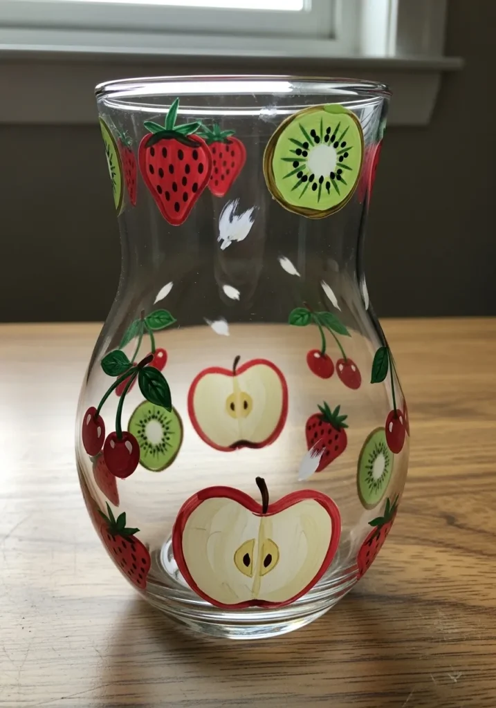 This shapely glass vase is a celebration of a summer harvest, featuring a charming variety of hand-painted fruits. The design includes juicy red strawberries with tiny black seeds, crisp apple halves showing off their pale yellow centers, vibrant green kiwi slices with dark speckles, and clusters of deep red cherries on delicate stems. Small white wisps are scattered between the fruit, adding a light and airy feel to the arrangement on the clear glass surface. Each piece of fruit is painted with opaque, glossy colors that make the designs look bold and cheerful, creating a lovely contrast with the smooth and transparent vessel.