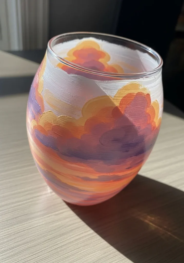 I am absolutely swooning over this project because it feels like capturing a perfect summer evening in a jar. If you are looking for a way to experiment with color blending without needing to be super precise, these billowy clouds are so forgiving and fun to swirl together. It is such a therapeutic process to layer those warm tones and watch the sky “light up” right in front of you. This would look stunning on a windowsill where the natural light can hit those thick paint ridges and really make the colors glow.