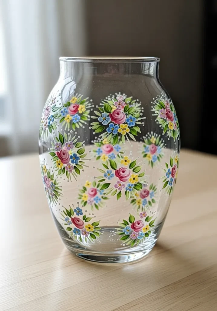 I am completely charmed by this design because it looks so incredibly professional, yet it is actually all about repeating simple patterns. If you have ever wanted to master that beautiful one-stroke painting style, these little floral medallions are a wonderful way to practice without feeling overwhelmed by a huge canvas. It is such a graceful way to update a plain glass piece from your cupboard and turn it into a family heirloom or a stunning gift for a friend. I love how the spacing between the bouquets keeps the vase feeling modern and sophisticated while still celebrating that timeless cottage garden look.