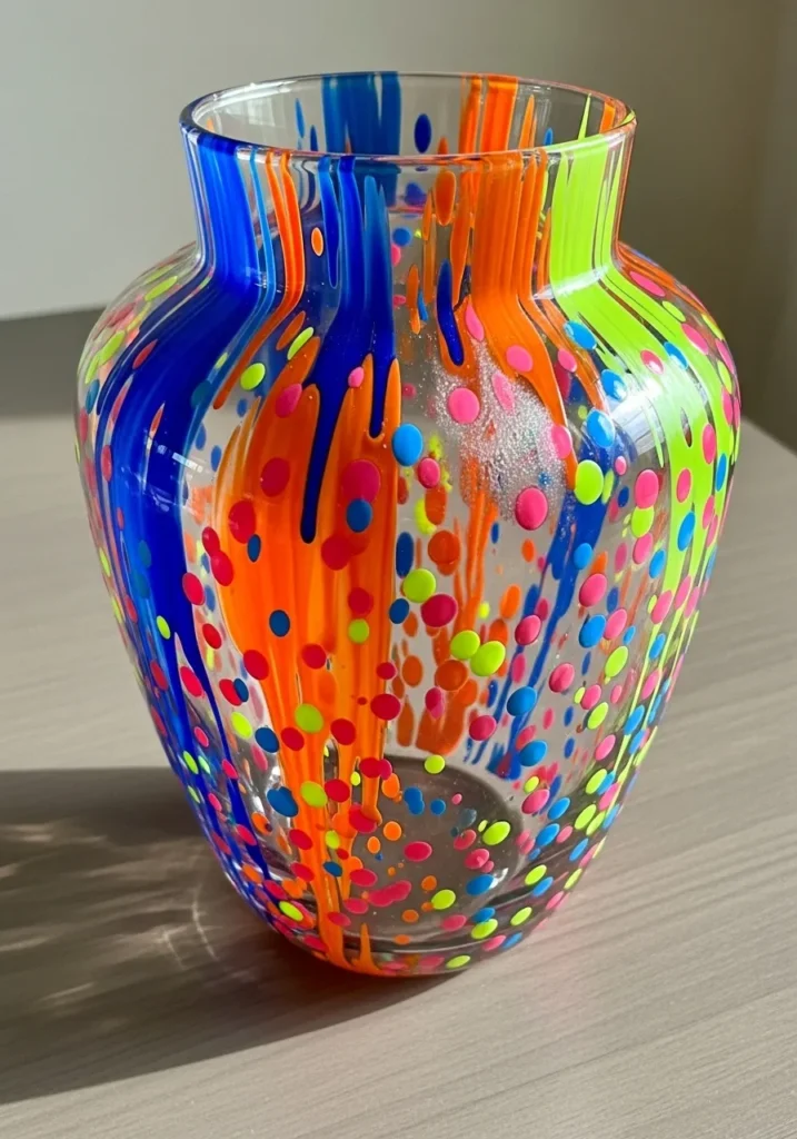 This bold glass vase is an explosion of energy featuring a dramatic drip technique in electric shades of cobalt blue, neon orange, and lime green. Long vertical streaks of saturated paint run down from the rim, creating a liquid motion effect against the transparent background. To add even more character, the piece is covered in a flurry of multi colored splatters and dots in hot pink, bright yellow, and cyan. The paint has a glossy, slightly raised texture that makes the colors look wet and fresh, giving the smooth glass a rugged and artistic edge that feels very contemporary.