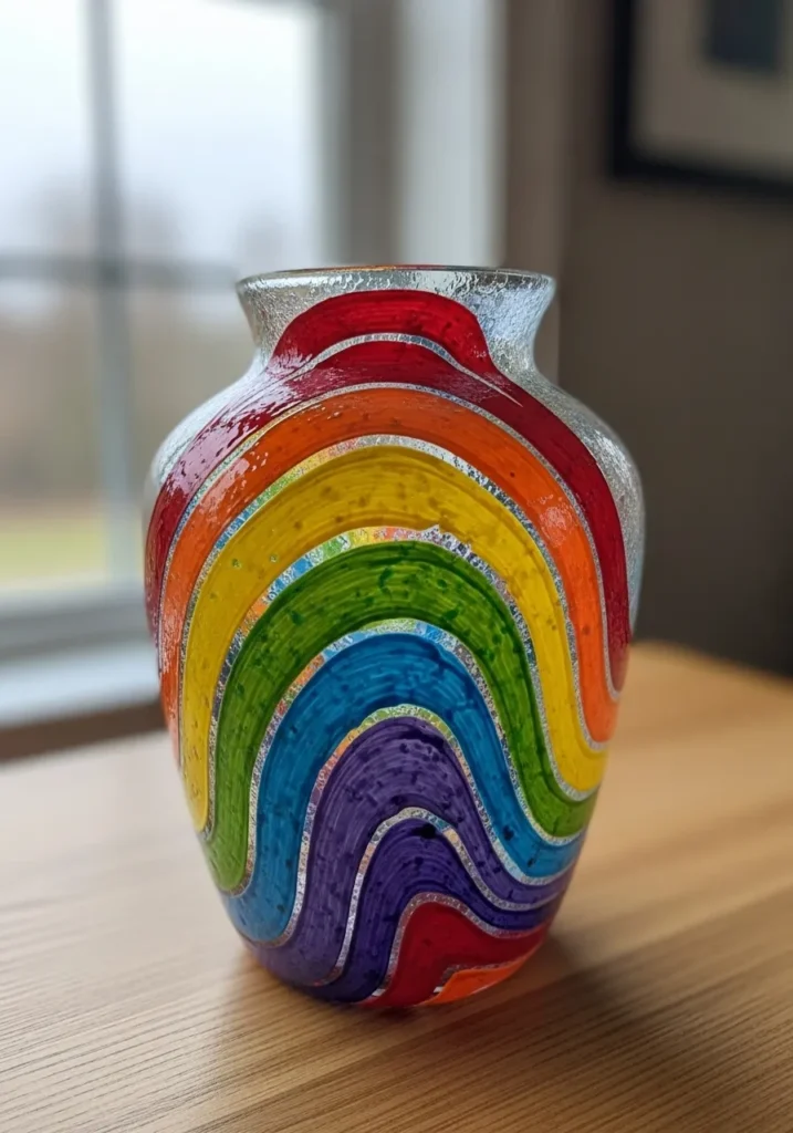 This eye-catching piece uses transparent glass paints to create a bold rainbow effect that wraps around a classic tapered vase. The design features thick concentric arches in primary and secondary colors like fiery red, sunny yellow, and deep royal blue. A frosted or crackled glass texture on the base adds a cool, icy contrast to the smooth, glossy finish of the painted sections. Each colorful stripe is separated by a thin shimmering silver border that mimics the look of professional leaded glass. This technique allows the light to pass through the colors beautifully, casting a multicolored glow on any surface it sits on.