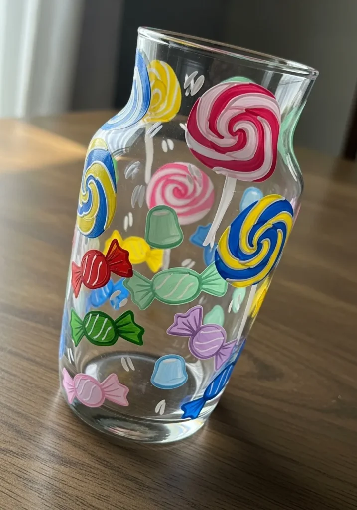 This playful glass vessel is a sugary delight, covered in a colorful assortment of hand-painted candies. The design features oversized lollipops with vibrant pink, yellow, and blue swirls, alongside classic wrapped hard candies in shades of cherry red, lime green, and grape purple. Small, translucent gumdrops in mint and sky blue are peppered throughout the arrangement, adding to the variety. The paint is applied with thick, visible brushstrokes that give the “sweets” a lovely textured appearance, while tiny white “shine” marks make the candy wrappers look crinkly and realistic against the clear glass.