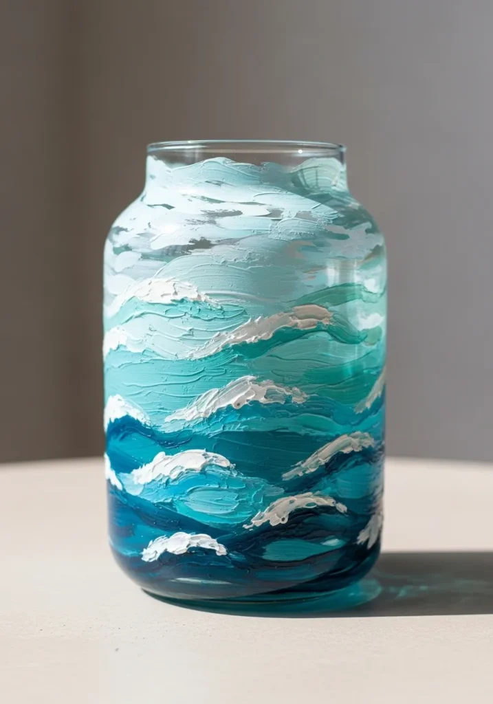 This stunning jar vase brings the power of the sea indoors with thick, sculptural layers of paint that create a realistic crashing wave effect. The artist used a palette of cool coastal tones, including deep navy, bright turquoise, and pale seafoam green, to give the water incredible depth. Those crisp white peaks are applied with a heavy hand, resulting in a ridged, 3D texture that looks like actual sea foam spraying off the glass. The brushwork follows a rhythmic, horizontal motion, which makes the entire piece feel like it is constantly flowing and moving under the light.