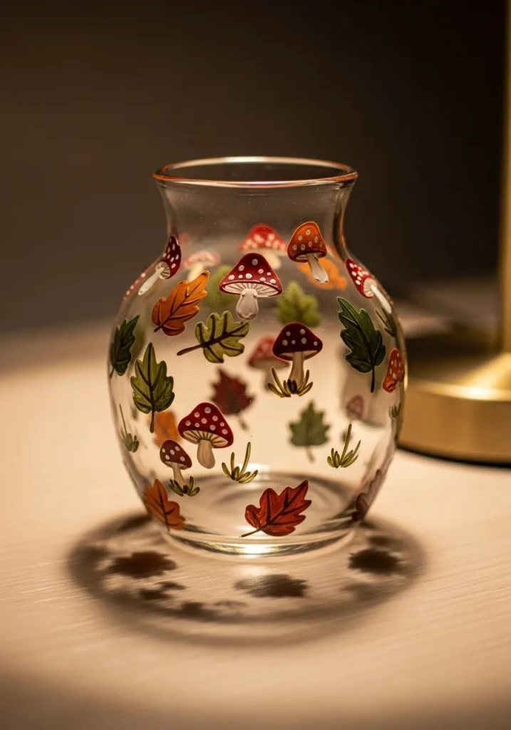 I absolutely adore this idea because it feels like bringing a little piece of a fairy tale right onto your dining table. If you’re into that cozy cottagecore aesthetic, this is the ultimate weekend project for you. No matter your skill level, these silhouettes are quite forgiving since the focus is on the cute shapes and those beautiful autumnal colors rather than perfect realism. It is such a rewarding way to customize a plain hurricane vase and create something that looks like it came from a high-end boutique.