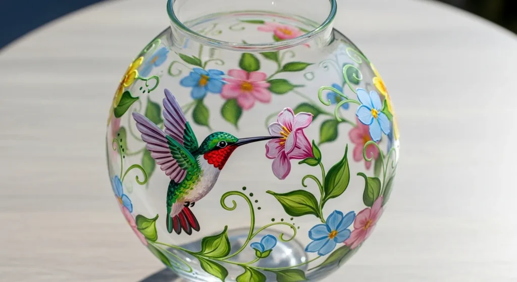 This cheerful glass vase is a true celebration of nature with its bright and lively hummingbird centerpiece surrounded by a lush floral border. The design features a stunning palette of jewel-toned blues, emerald greens, and a splash of fiery red on the bird, which contrasts beautifully with the soft pink roses and sunny yellow lilies in the background. Each element is painted with crisp outlines and detailed shading that gives the whole scene a high-energy feel. The paint looks thick and glossy against the clear glass, which creates a lovely depth that makes the garden seem to wrap around the entire vessel.