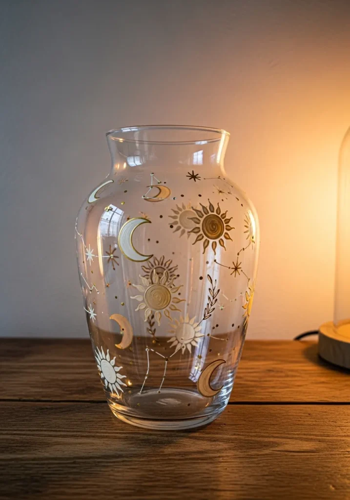 This enchanting glass piece combines celestial motifs with a delicate botanical touch for a truly mystical look. The design features various sun and moon symbols scattered across the clear glass, rendered in shimmering gold, soft cream, and deep bronze tones. You can spot intricate details like tiny swirling sunbeams, crescent moons with fine linework, and delicate stars connected by minimalist constellation threads. To tie it all together, small leafy sprigs are tucked between the celestial bodies, creating a unique “sky garden” effect that feels both grounded and otherworldly.