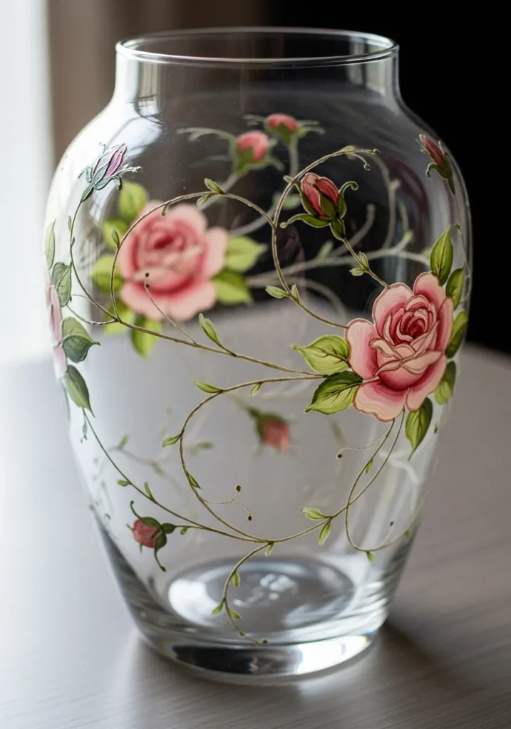 This exquisite glass vase features a dreamlike scene of blush pink roses and tightly furled buds wandering across the clear surface. The design uses a delicate layering technique where the petals transition from a deep magenta core to a soft powdery pink at the edges. Wispy olive green vines and tiny leaves connect the blooms with incredible fluidity, while subtle white highlights give the foliage a gentle sheen. The texture is wonderfully smooth with just a hint of raised enamel where the rose petals overlap, creating a piece that feels both antique and fresh at the same time.