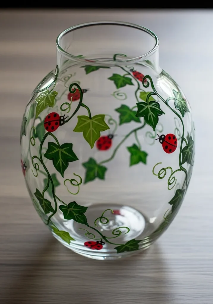 This darling glass vase features a playful scene of winding ivy vines and bright red ladybugs. The design uses several shades of forest and lime green to create pointed ivy leaves that appear to wrap naturally around the rounded glass surface. Tiny lime green tendrils curl off the main stems which adds a sense of whimsical growth to the piece. The focal points are the cheerful ladybugs painted in a bold tomato red with crisp black spots and tiny antennae. The use of opaque paints against the transparent background makes the little critters look like they are crawling through a real garden hidden inside the glass.