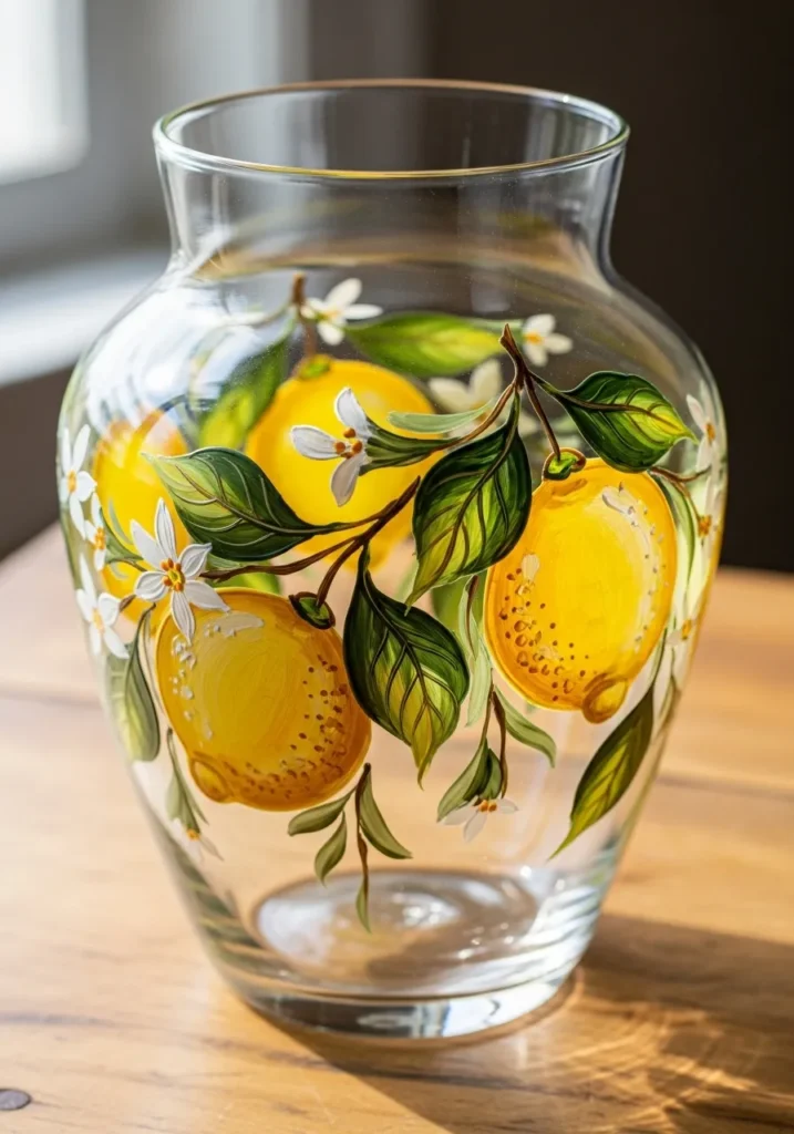 This vibrant glass vase features a zesty Mediterranean design with plump lemons and delicate citrus blossoms. The artist used a rich sunshine yellow for the fruit, adding tiny brown speckles and white highlights to give them a realistic pitted texture. Deep emerald leaves with lighter green veining provide a bold contrast, while the tiny white flowers with orange centers add a touch of sweetness to the overall look. The paint is applied with thick, confident strokes that make the design pop beautifully against the clear, smooth glass background.