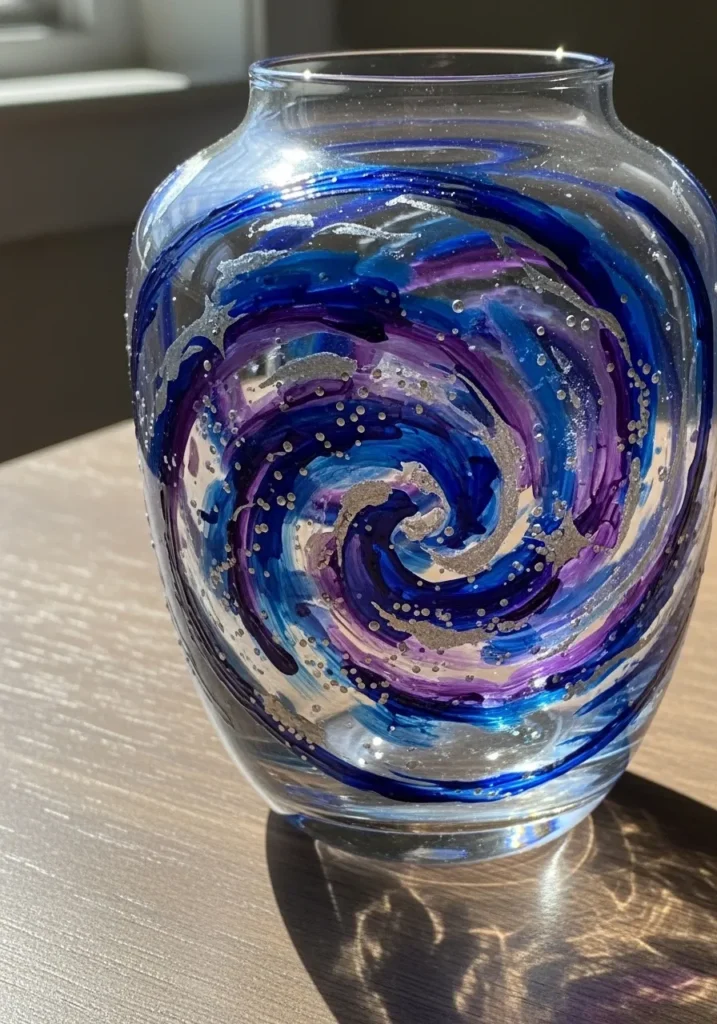 This mesmerizing glass vase captures the vast beauty of a deep-space nebula with its energetic spiraling design. The color palette is a rich mix of royal purple and electric blue, applied in circular, sweeping strokes that create a sense of infinite movement. Scattered throughout the cosmic swirls are shimmering silver glitter accents and tiny white dots that perfectly represent distant stars and stardust. The paint has a wonderful translucent quality in some areas while remaining bold and opaque in others, allowing the light to filter through the glass and make the galaxy appear as if it is truly glowing from within.