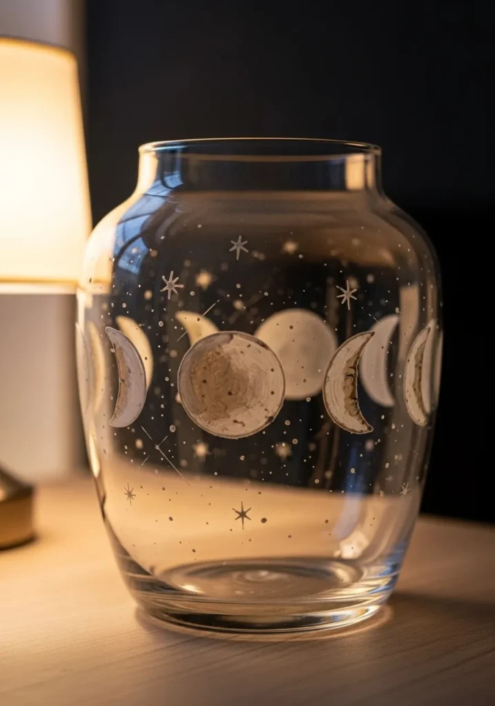 This dreamy glass jar showcases the different stages of the moon in a beautiful vertical arrangement. The design uses a mix of metallic gold outlines and earthy bronze tones to create a mystical celestial look. You can see fine details like shimmering gold leaf accents and tiny white stars connected by delicate constellation lines. The textures are a mix of smooth glass and slightly raised paint that gives the lunar surfaces a realistic cratered appearance. It features a warm and moody palette that looks especially magical when it catches the evening light.