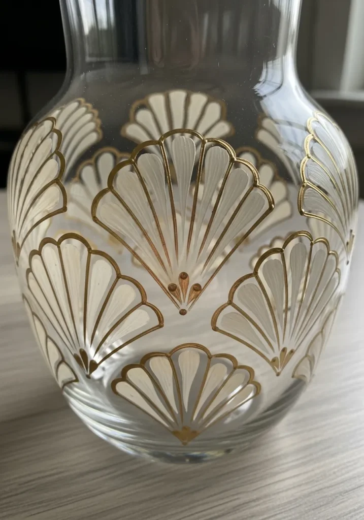 This stunning glass pitcher features a repeating fan motif that brings a sophisticated vintage vibe to any tabletop. The artist used a rich gold outliner to create crisp scales or shell-like borders, which are then filled with a soft, creamy white glass paint. You can actually see the delicate brushstrokes within each petal of the fan, adding a lovely hand-painted texture that looks much more expensive than it is. The contrast between the metallic gold and the opaque white against the clear glass creates a balanced look that is both bold and airy.