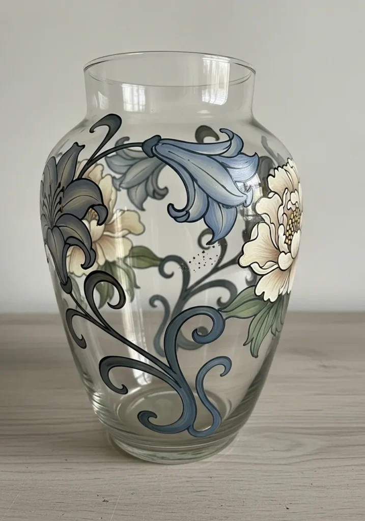 This graceful glass vase features a stunning mix of bell-shaped blooms and lush peonies framed by dramatic swirling vines. The color palette is wonderfully refined with dusty blues, muted teals, and creamy off-white petals that give the piece a classic feel. You can see the bold black outline used to define every curve, which creates a beautiful stained-glass effect against the clear background. The artist used a combination of opaque and slightly sheer paints to add depth to the leaves and flower centers, making the whole design pop with a sophisticated illustrative style.