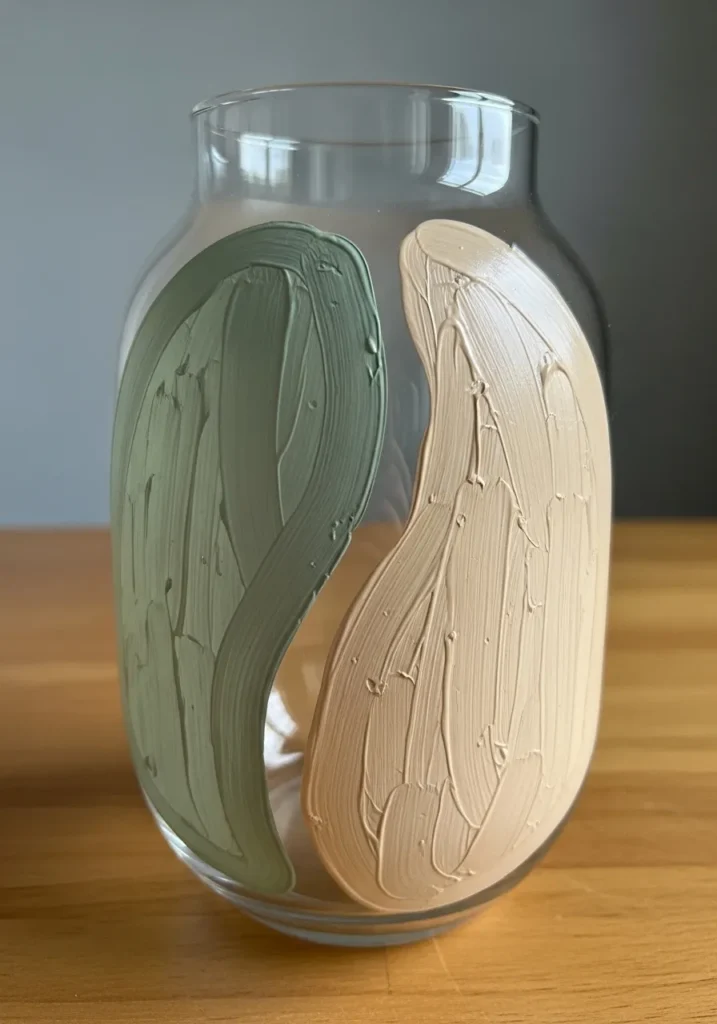 This glass vase features thick and textured acrylic paint applied in bold, organic shapes. The muted sage green and warm sandy beige tones create a soft contrast against the clear glass. Each stroke is visible with raised edges that give the piece a wonderful 3D quality. It is a minimalist design that focuses on the raw movement of the brush rather than complex patterns.