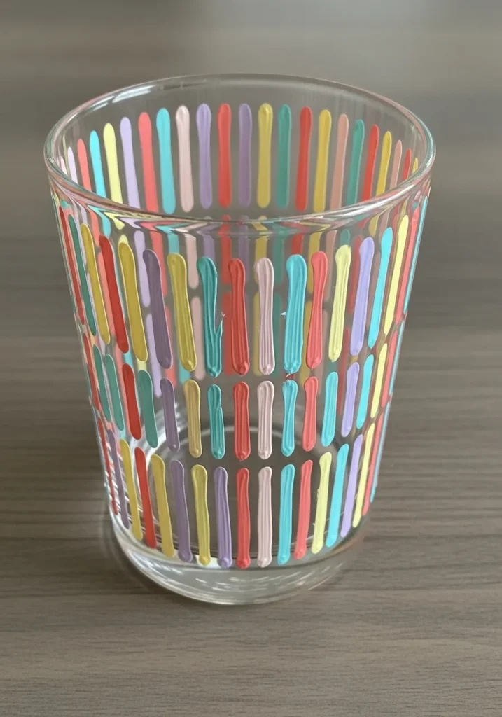This playful tumbler includes rows of vertical paint dashes that wrap entirely around the glass. The color scheme is a cheerful mix of coral red, sunny yellow, mint green, and soft lavender. Each stroke is thick and opaque, which gives the design a fantastic pop against the clear glass. The texture of the acrylic is slightly raised, so you can really feel the handmade quality of every single mark. It is a wonderfully energetic pattern that transforms a basic kitchen glass into something that feels like a boutique find.