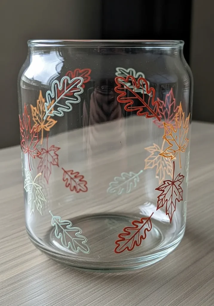 This can-shaped glass is decorated with a beautiful scattering of falling leaves in various shapes and sizes. The design uses thin and precise acrylic outlines in warm tones of burnt orange, golden yellow, and a surprising pop of sage green. Each leaf is depicted with its veins showing, which gives the whole piece a really intricate and detailed look. The transparent center of each leaf allows the light to pass through the glass while the colorful borders create a lovely seasonal vibe. It is a sophisticated way to bring a touch of nature to your glassware collection with a very clean finish.