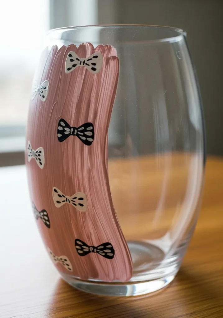 This stemless glass piece highlights a broad vertical sweep of mauve acrylic paint with visible brushstrokes that add a rich texture to the surface. Floating on top of this rosy background are several hand-painted bows in alternating black and white shades. Each bow is detailed with tiny dots and stripes, which give them a playful and illustrative quality. The contrast between the solid paint section and the remaining clear glass creates a modern, asymmetrical look that is perfectly on trend.