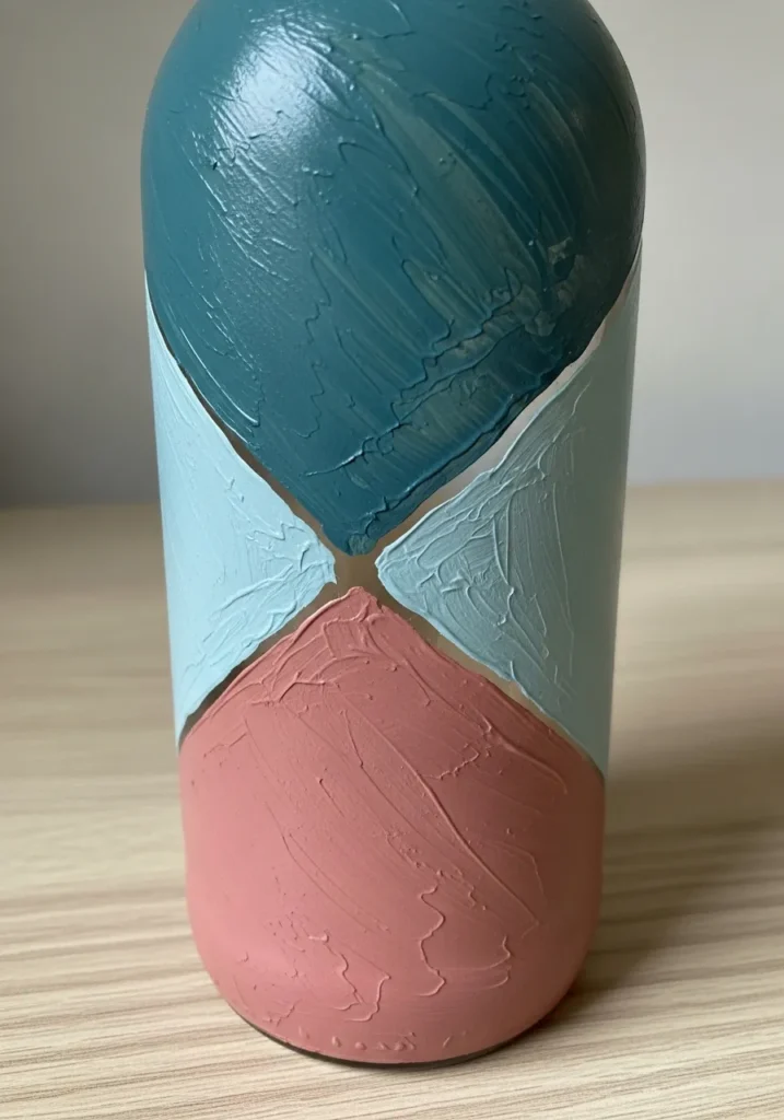This bottle centers on a bold and geometric design using large sections of thick acrylic paint. The color palette is a sophisticated trio of deep teal, soft sky blue, and warm terracotta pink. What really makes this piece stand out is the heavy texture and visible palette knife strokes that give the glass a cool 3D feel. The sharp and clean lines between the colors contrast beautifully with the rough and organic application of the paint. It is a fantastic way to transform a simple glass container into a modern art piece for a shelf or side table.