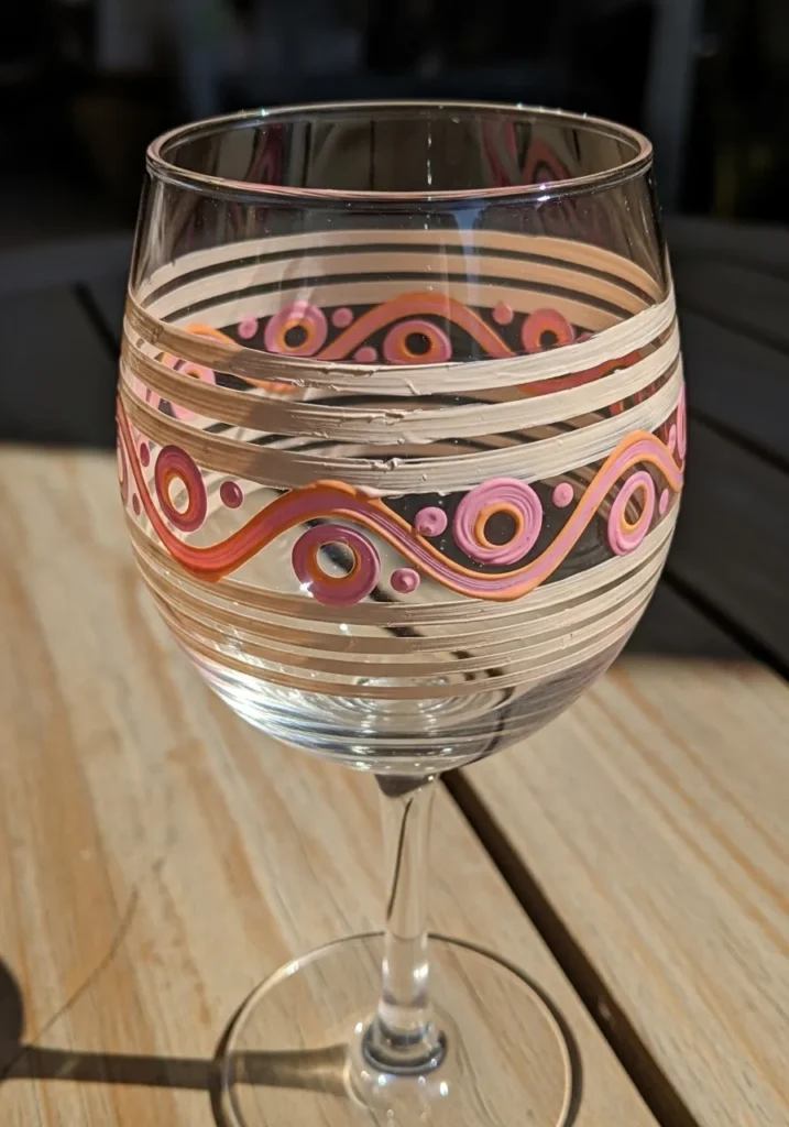 This elegant wine glass has a layered bohemian pattern that wraps around the center of the bowl. The design combines horizontal bands of creamy off-white paint with a whimsical wavy line in shades of coral and dusty rose. Tucked within the waves are tiny hand-painted swirls and dots that give the piece a detailed and artisanal look. The acrylic is applied with a slightly raised texture, which adds a wonderful tactile element to the smooth glass surface. It is a fantastic way to give a standard wine glass a custom and high-end feel for your next dinner party.