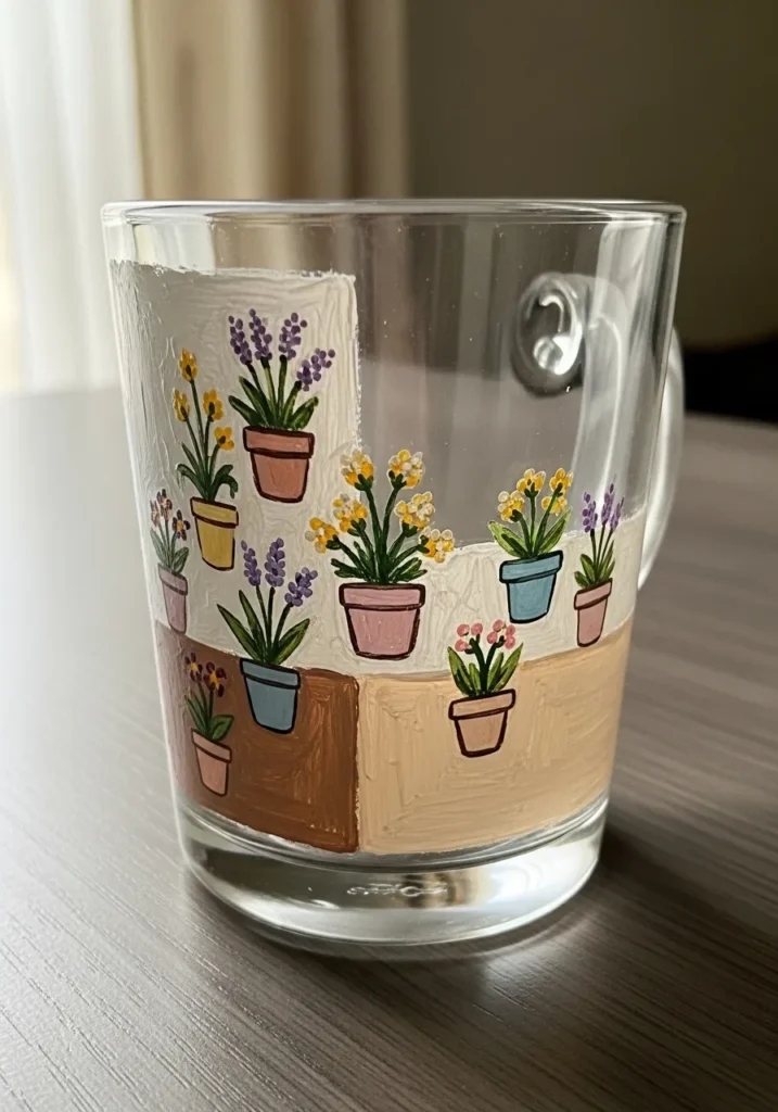 Drinking from a mug this cute instantly makes the experience more enjoyable. It is such a fun project because you can essentially paint your dream windowsill garden without ever having to worry about watering a single thing. The blocky background makes it easy to organize your little scene, and you can get really creative with the different flower shapes and pot colors. It is a fantastic way to personalize your morning tea routine or to make a thoughtful and artistic gift for a fellow plant lover.