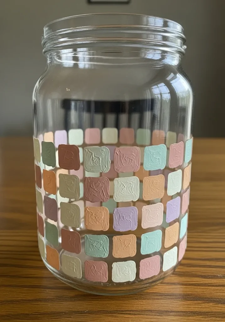 This clear glass jar is wrapped in a charming grid of hand-painted squares that resemble tiny ceramic tiles. The palette is a beautiful collection of muted earthy tones, including sage green, dusty mauve, terracotta, and soft lilac. Each square is applied with a thick layer of acrylic paint, showing off a wonderful swirl of texture within every individual block. The consistent spacing between the tiles allows the glass to peek through like grout, which makes the whole design feel very balanced and intentional. It is a lovely way to give a simple storage jar a cozy and artisanal look that fits perfectly in a modern kitchen or craft room.