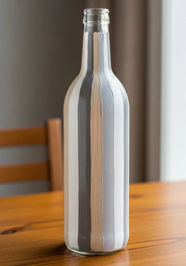 This glass bottle showcases a gorgeous array of vertical hand-painted stripes that run from the neck all the way to the base. The palette is wonderfully grounded with shades of charcoal gray, soft tan, creamy white, and a cool slate blue. Each stripe has a thick and slightly ridged texture from the brush that gives the bottle a rustic yet modern feel. The colors overlap just enough to show that it is handmade and perfectly unique. It is a fantastic way to repurpose a simple bottle into a piece of high-end-looking home decor.