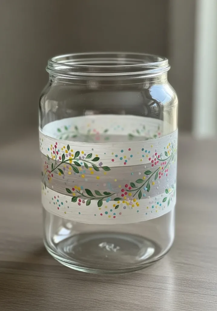 A tidy kitchen is great, but adding a touch of cuteness makes it even better. You can use painter’s tape to get those crisp edges for the band and then just have fun with a tiny brush for the flowers. It is a fantastic way to upcycle old jars into something that feels fresh and gift-worthy. Plus, the little dots are so easy to add, even if you are just starting with glass painting.