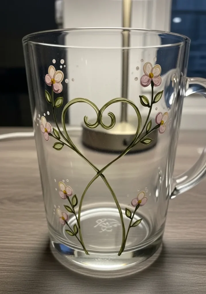 This transparent glass mug features a dainty and illustrative botanical design painted with fine brushwork. The centerpiece is a pair of olive green vines that gracefully curve toward each other to form a delicate heart shape. Adorning these stems are several small hand-painted flowers in a soft dusty pink with subtle white highlights and tiny yellow centers. Little white dots are scattered around the blossoms like floating petals or fairy dust. The overall look is incredibly feminine and sweet with a polished finish that lets the glass shine through.