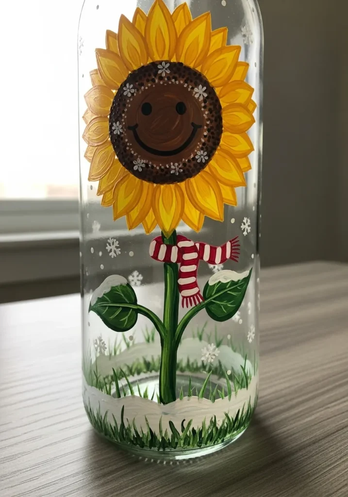 I am head over heels for the way this craft mixes summer vibes with winter coziness. It is such a clever way to keep the sunshine in your home even when the weather outside is gloomy. If you have some old wine or soda bottles lying around, this is a fantastic beginner project because you only need a few basic paint colors and a steady hand. I love how the scarf adds a whimsical personality that will definitely spark conversations when you use it as a vase or a centerpiece.