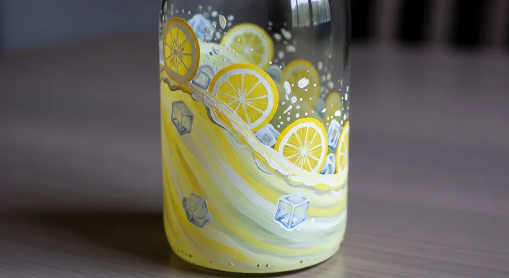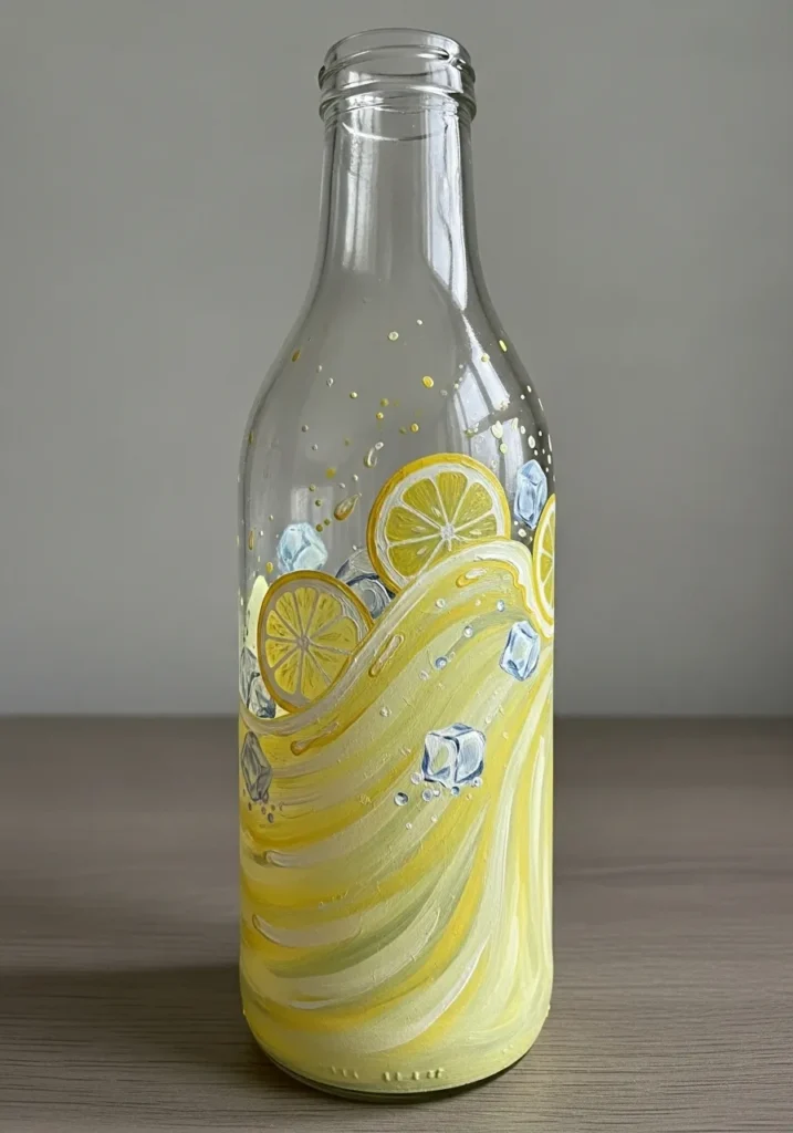 I am absolutely charmed by how this bottle looks like a frozen moment of pure refreshment. It is such a clever way to practice painting glass textures and liquid effects without needing a canvas. If you’re looking to brighten up a kitchen counter or want a unique way to serve chilled water at a brunch, this design is a total winner. I love that the ice cubes add a cool touch to the warm yellow palette, making it feel like a little piece of sunshine you can keep all year round.