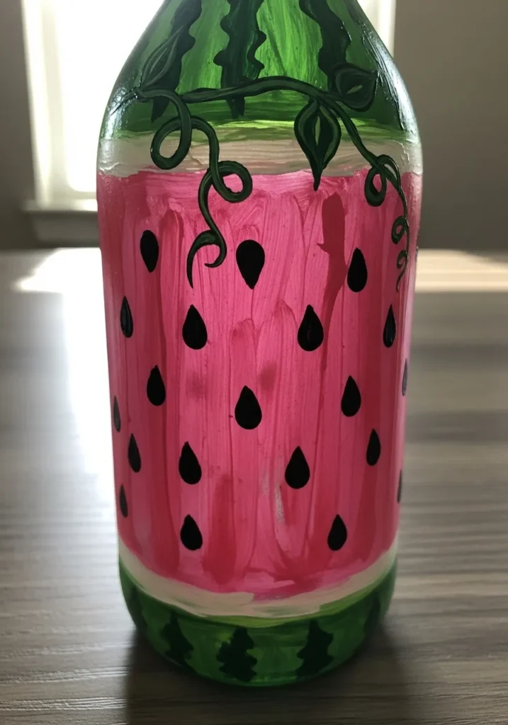 This charming glass bottle is painted to resemble a giant, juicy slice of watermelon, complete with all the summery details. The main body features a vibrant, streaky pink paint that looks just like sweet fruit pulp, dotted with perfectly shaped black teardrop seeds. A thick white stripe separates the pink from a rich green base that mimics the rind, while the top of the bottle is adorned with swirling green vines and delicate leaves. The texture is wonderfully tactile with visible brushwork that gives the entire piece a rustic, homemade appeal.