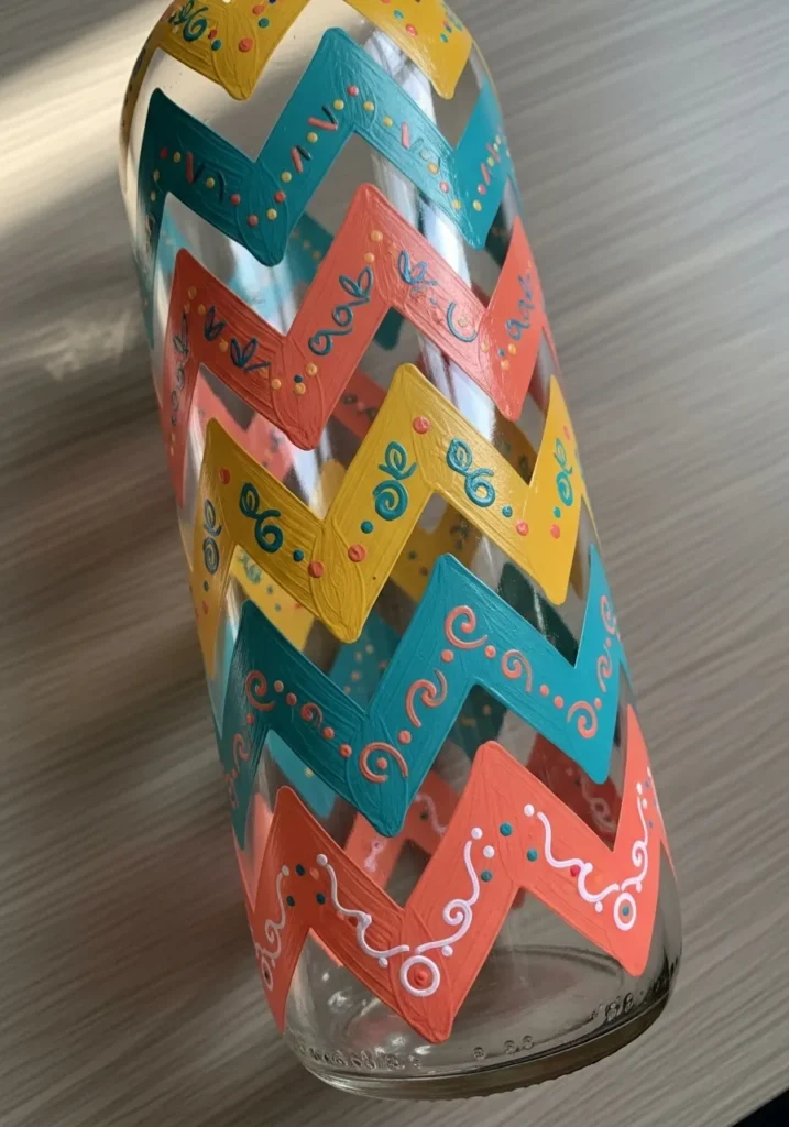 This clear glass bottle is decked out in thick and textured zigzag bands that wrap all the way around its middle. The color palette is a total bohemian dream, featuring a vibrant coral, a sunny golden yellow, and a bright Mediterranean turquoise. Each chevron stripe is uniquely detailed with hand-painted doodles like tiny dots, delicate swirls, and little leaf-like accents in contrasting white and blue tones. The paint has a rich and opaque quality that creates a wonderful 3D effect against the smooth and transparent glass background.