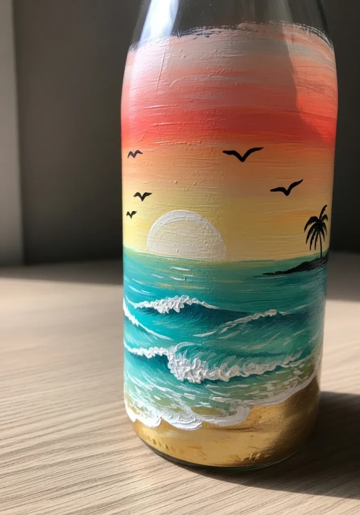 This bottle captures a breathtaking seaside sunset with thick, impasto-style acrylic layers that jump off the glass. The top transitions from a soft peachy pink into a warm, glowing yellow where a pale sun hangs just above the horizon. Below, the turquoise ocean is filled with churning white-capped waves that lead down to a shimmering base of metallic gold sand. Tiny details like the black silhouettes of soaring seagulls and a lone palm tree on a distant island give the entire scene a wonderful sense of depth and peacefulness.