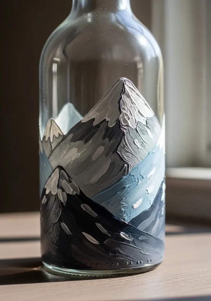 I’m really digging how this project uses texture to create a sense of scale and adventure on such a small surface. It is a fantastic way to play with shading and highlights because the “snow” can be as messy as you like and still look intentional. If you have a travel lover in your life, this would make a stellar personalized gift or a cool piece of decor for a cozy cabin themed room. I love that the transparent top of the bottle leaves plenty of “sky” room, making the whole scene feel open and airy despite the bold paint.