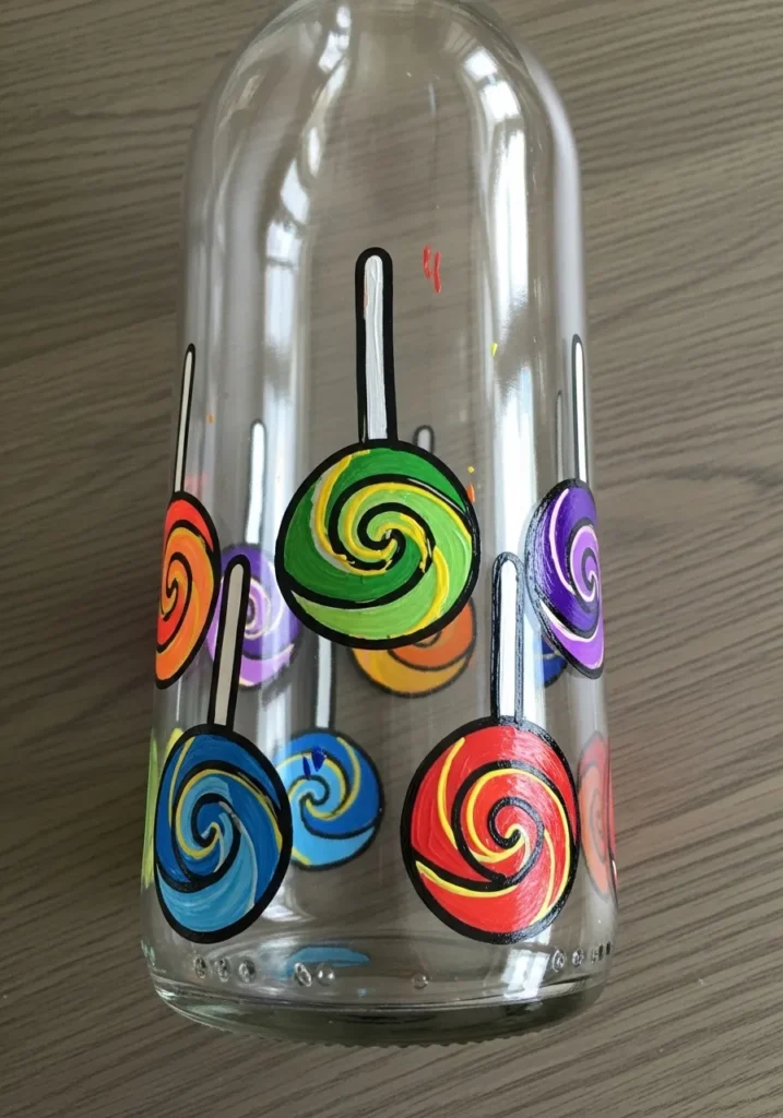 I’m enamored with how this project manages to be both playful and sophisticated at the same time. It is a fantastic way to practice your circular brushstrokes and color mixing without needing a lot of expensive equipment or a massive time commitment. If you’re into the sweet and kitschy kitchen aesthetic, this bottle would look absolutely darling holding some actual candy sticks or even just acting as a cheerful water carafe on your nightstand. I love that it feels so joyful and nostalgic, like a little bit of childhood magic captured in a piece of home decor.