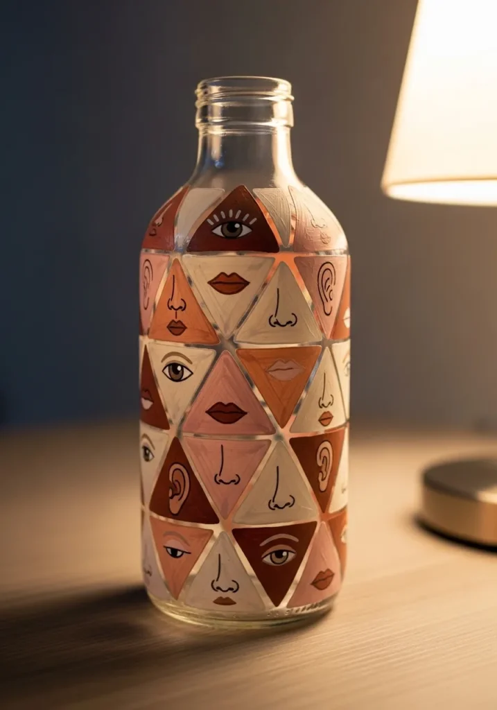 This stunning clear bottle is transformed into a piece of modern art through a mosaic of hand-painted triangles. The design uses a gorgeous palette of skin tones, including terracotta, dusty rose, cream, and deep espresso, to create a warm and inclusive feel. Inside each triangular segment, a different facial feature, like a stylized eye, a pair of lips, an ear, or a nose, is delicately illustrated with fine black lines. The matte texture of the paint stands out against the glossy glass, while the thin unpainted gaps between the shapes give it a professional stained glass effect.