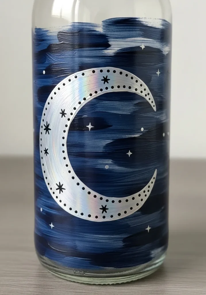 Deep navy blue brushstrokes wrap around this glass bottle to create a textured night sky that looks like a moody oil painting. A large silver crescent moon sits front and center, featuring a subtle pearlescent shimmer and intricate black dotted borders. The moon is decorated with tiny black stars, while smaller white twinkles are scattered across the dark background. You can actually see the movement in the paint layers, which gives the whole design a dreamy and handcrafted depth.