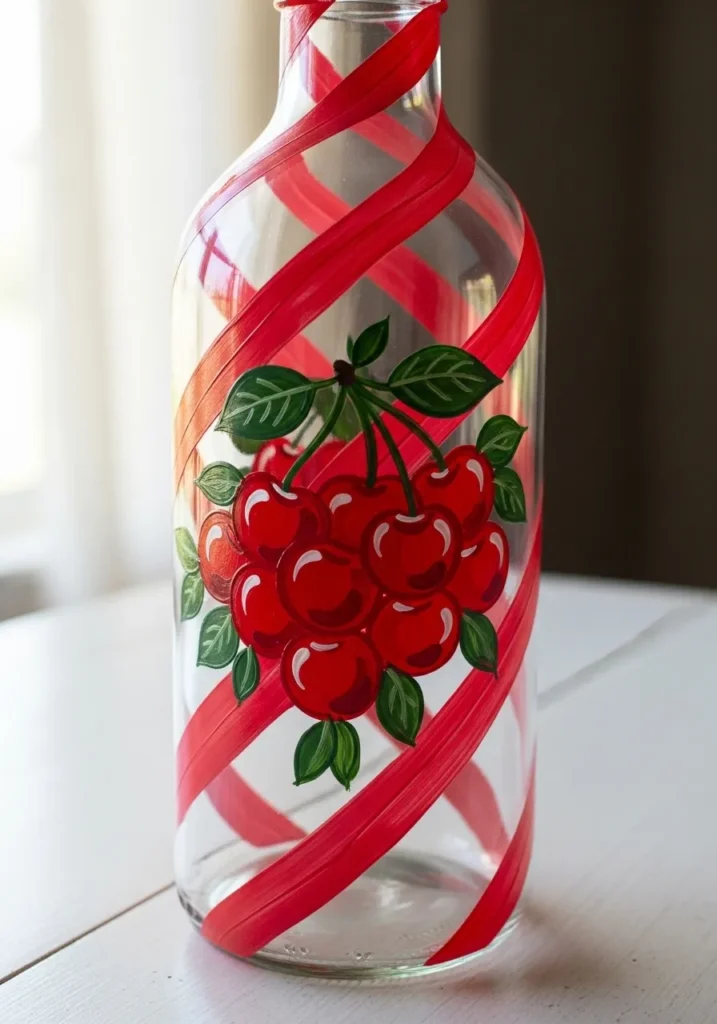 This clear glass bottle sports a bold and playful look that feels like a trip back to a vintage soda fountain. A vibrant cluster of glossy red cherries takes center stage, featuring bright white highlights that make the fruit look juicy and three-dimensional. Surrounding the fruit are deep forest green leaves and a thick candy cane striped ribbon in cherry red and soft coral that spirals elegantly from the base up to the neck. The paint has a lovely opaque quality with visible brushstrokes that add a delightful handcrafted texture to the smooth glass surface.