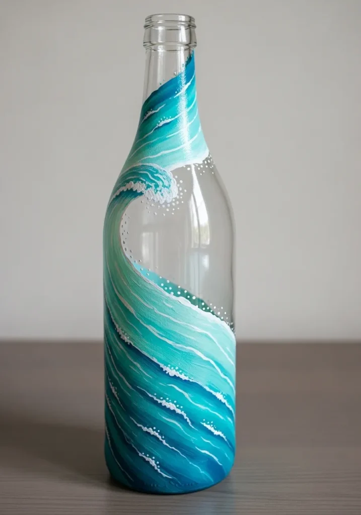 This elegant glass bottle features a stunning wrap-around design of a powerful ocean wave in motion. A gradient of deep navy, vibrant turquoise, and soft seafoam green layers creates a sense of depth and fluidity against the clear glass. The crest of the wave is tipped with textured white paint to mimic sea foam, while delicate white dots are scattered around the edges to represent salty sea spray. The brushwork follows the natural curve of the bottle, which enhances the feeling of a rolling tide.