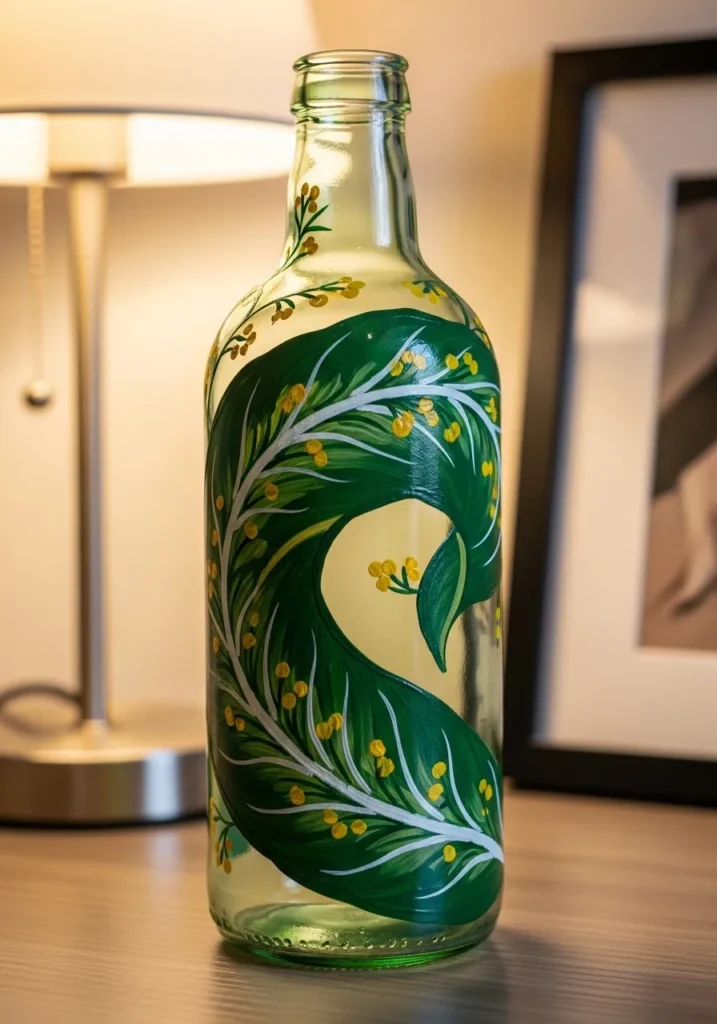 I think this is such a sophisticated way to bring a bit of nature indoors without the maintenance of a real plant. It is a fantastic project if you want to practice creating movement and flow with your brushstrokes. I am truly impressed by how the gold and white accents make the greenery pop against the natural tint of the glass. If you have a stray wine bottle or an old vinegar jar, this design would look absolutely stunning sitting on a bookshelf or acting as a chic water carafe for your guest room.