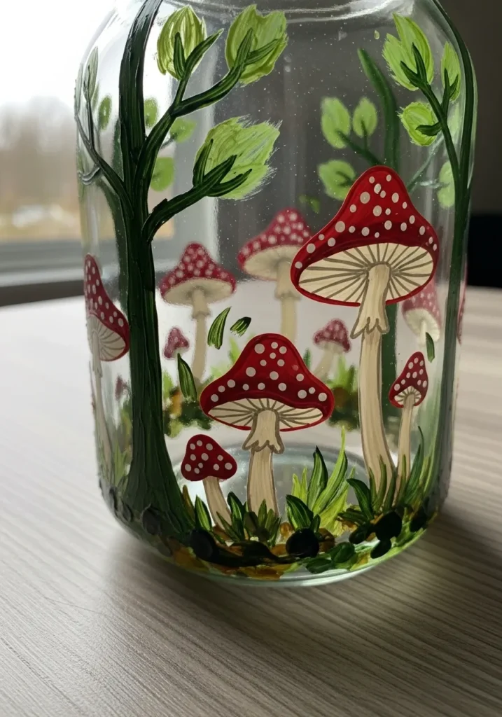 I am genuinely impressed by how a simple kitchen jar can turn into a fairy tale accent piece with just a little bit of paint. If you love that cottagecore aesthetic, this is such a rewarding project because it does not require perfect straight lines to look amazing. It feels incredibly relaxing to just dot on those little mushroom spots while sipping some tea. You could easily use this to hold your favorite makeup brushes or even a small tea light to watch the forest glow.