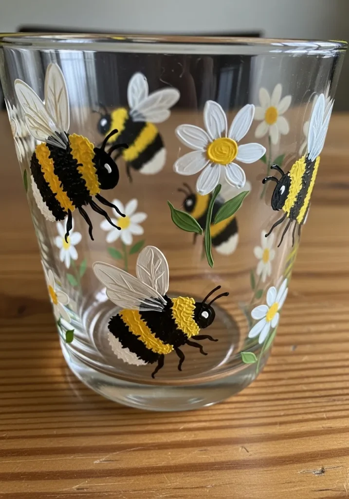 It’s amazing how much personality these little bees show. Transforming a plain kitchen glass into a whimsical piece of art like this is a fantastic way to brighten up your table setting. The design is actually very approachable because the bees are made from simple oval shapes, and the daisies just require a few steady brushstrokes. It is a wonderful choice for a weekend DIY project that results in something both practical and super cute.