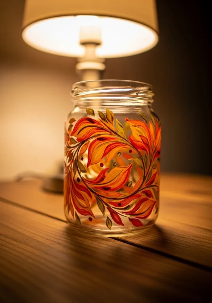 Most people would love how this project brings a cozy seasonal feel to any room without much effort. It is a fantastic way to upcycle an old jam jar into a stunning candle holder or a seasonal vase. The swirling vine technique is quite forgiving because you can just let your brush follow natural loops across the glass surface. Using a battery-operated tea light inside would make those orange and red hues really shine on a chilly evening.