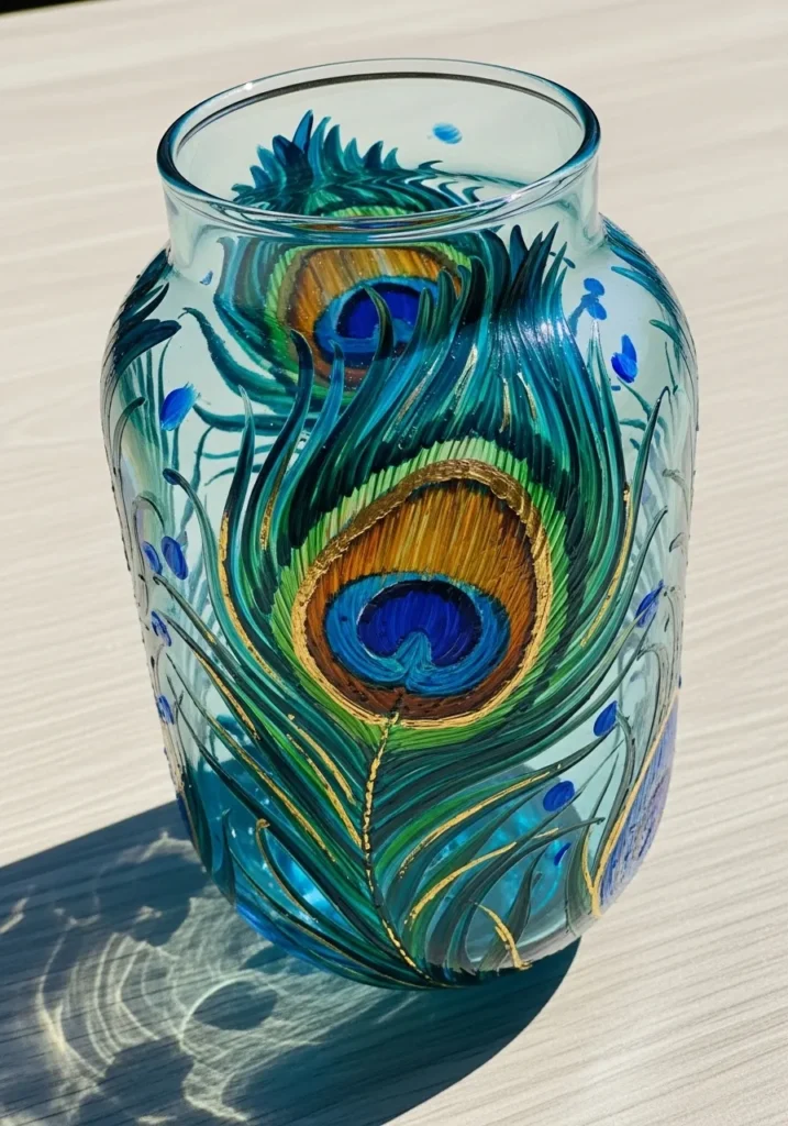 This breathtaking glass vessel shows oversized peacock feathers that wrap around the curves with incredible detail. The artist used a regal palette of deep teal, emerald green, and shimmering bronze acrylics to capture that signature iridescent sheen. Each feather eye is built with layers of royal blue and golden ochre, while the wispy barbs are painted with very fine, sweeping brushstrokes that give the design a light and airy texture. The translucent blue glass base adds an extra layer of depth, making the entire piece look like a high-end gallery find.