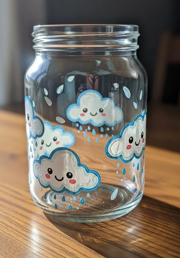 This clear glass mason jar features several fluffy white clouds outlined in a bright cerulean blue. Each cloud has a friendly face with tiny black eyes and rosy pink cheeks painted with opaque acrylic glass paint. Delicate blue raindrops and silver accents fall from the clouds while some extra white highlights give the shapes a soft, textured look. The overall design is clean and cheerful, making the simple jar look like a piece of custom boutique decor.