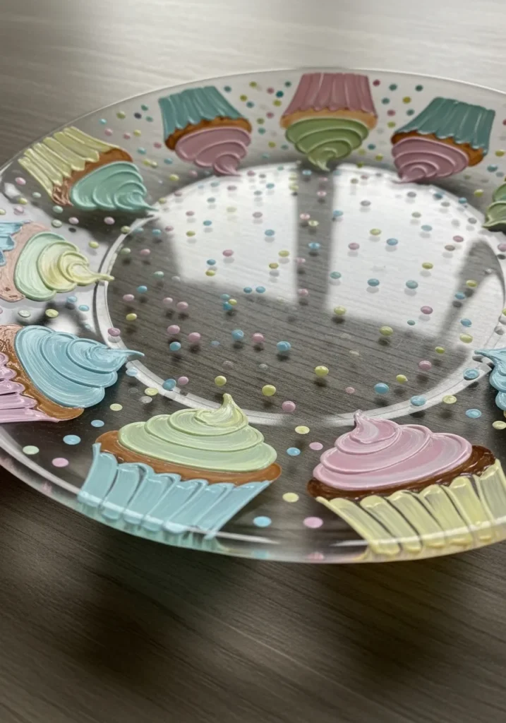 This adorable glass plate includes a ring of hand-painted cupcakes that look good enough to eat. The artist used thick, dimensional acrylics in sugary shades of mint, strawberry pink, and lemon yellow to create the swirled frosting effect. Each little treat is nestled in a colorful ribbed liner, with tiny multi-colored dots scattered across the clear glass to mimic a sprinkle-filled celebration. The raised texture of the paint gives the design a playful 3D feel that really pops against the smooth surface of the platter.