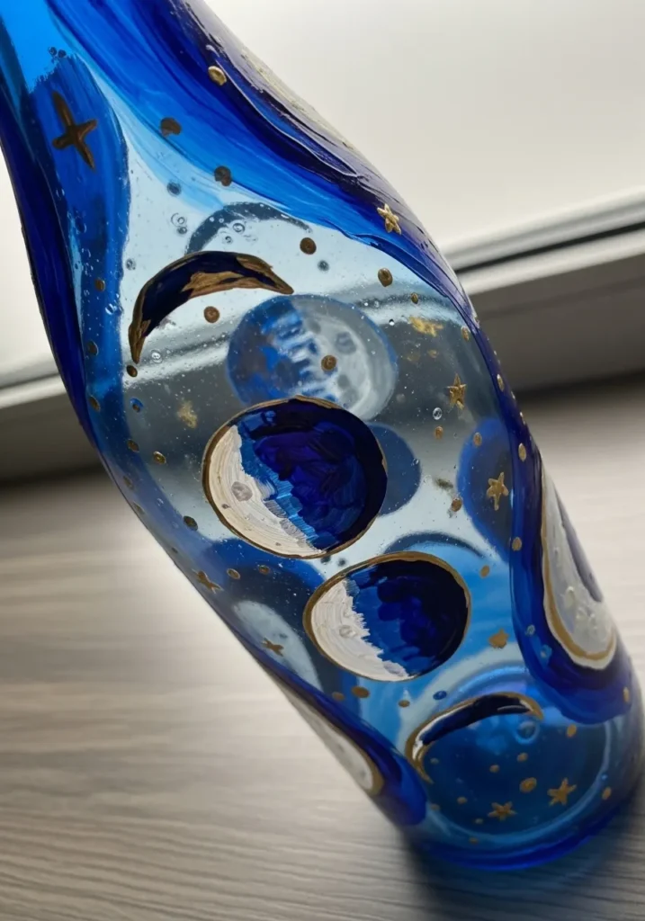This striking blue glass bottle serves as a dreamy canvas for a series of metallic and midnight-toned moon phases. Swirls of deep sapphire and airy azure paint wrap around the curves of the glass, creating a sense of movement like a cosmic tide. Small gold stars and shimmering dots are scattered across the surface to mimic a twinkling night sky. The contrast between the solid white crescent moons and the translucent blue glass gives the whole piece a magical glow that looks especially beautiful when the light catches the metallic outlines.