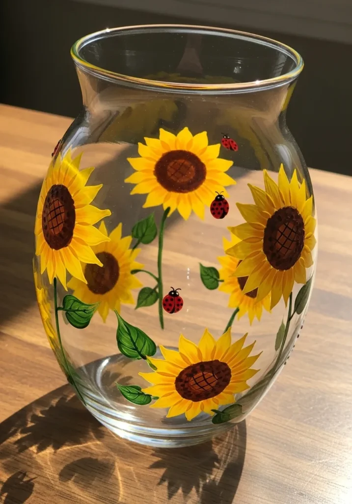Sunflower and Ladybug Painted Vase